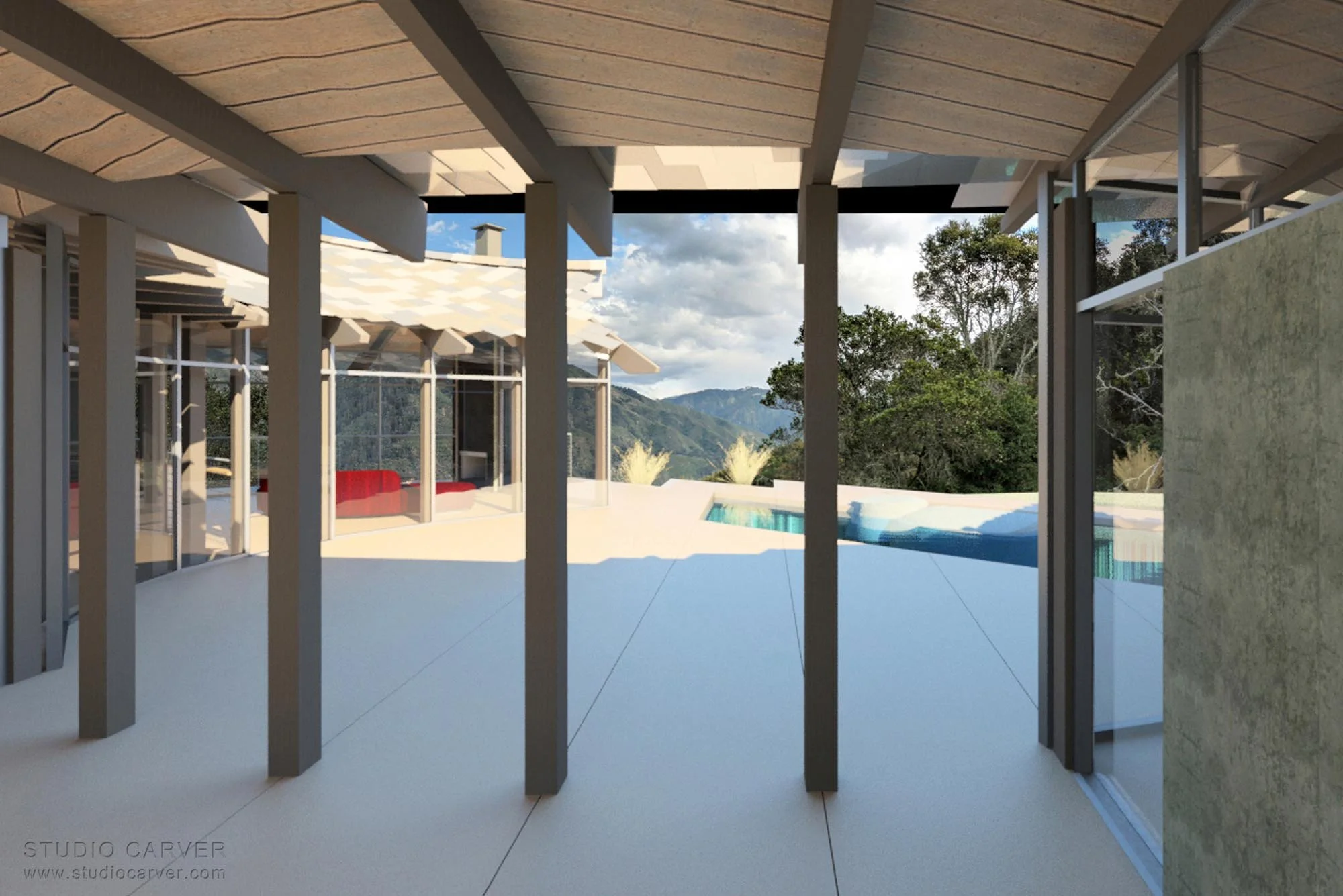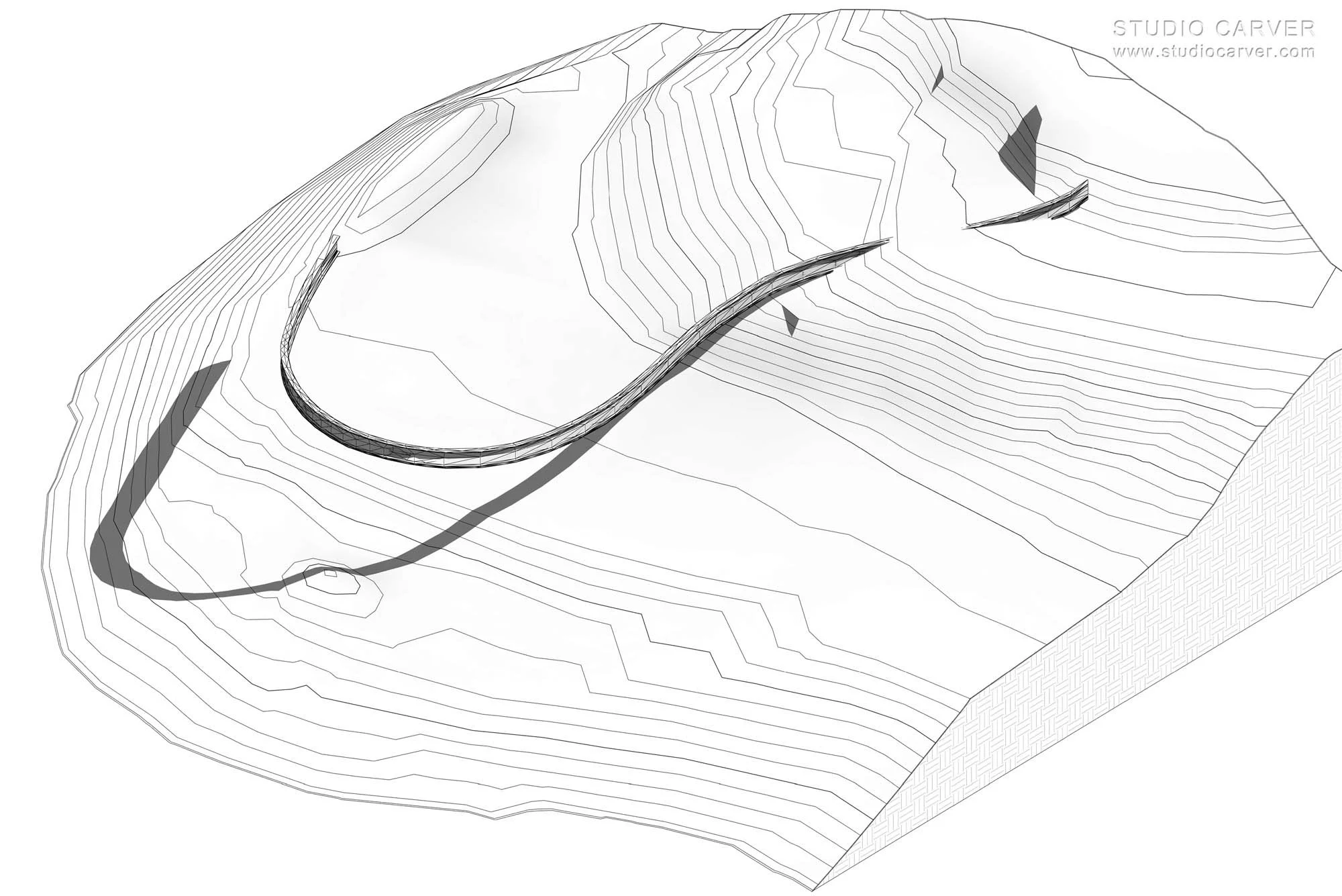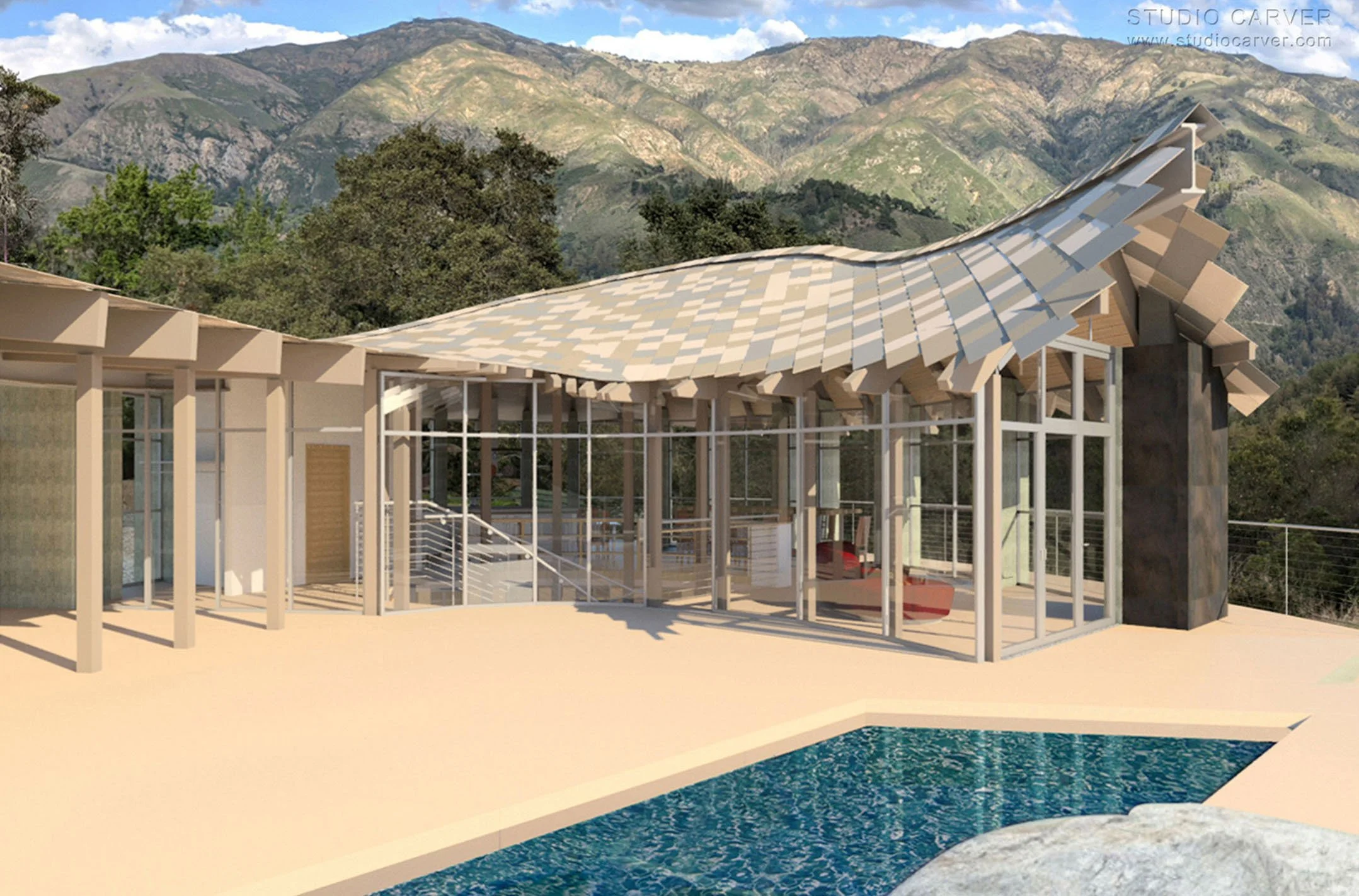 The Dragon’s Den is a two-story residence nestled in the mountains of Big Sur. The structure and form were inspired by the native Western Fence Lizard found on the site. The roof is adorned with multicolored stainless-steel tiles evocative of reptilian scales and coloring, while steel and redwood abstract the skeleton. The form, inspired by nature, was realized via parametric modeling to encode the relationship between elements. The spine is a sinuous compound curved steel ridge beam supporting linear redwood beams at informed angles. The dynamic roof emerges from shingling unitized panels in a consistent manner across the interpolated surface. The rhythm of structural walls positioned along the curving perimeter serve to frame distinct views of the Ventana wilderness. The floor plan is curved, and the roof is serpentine; however, there is only one curved element in the house – the ridge beam.