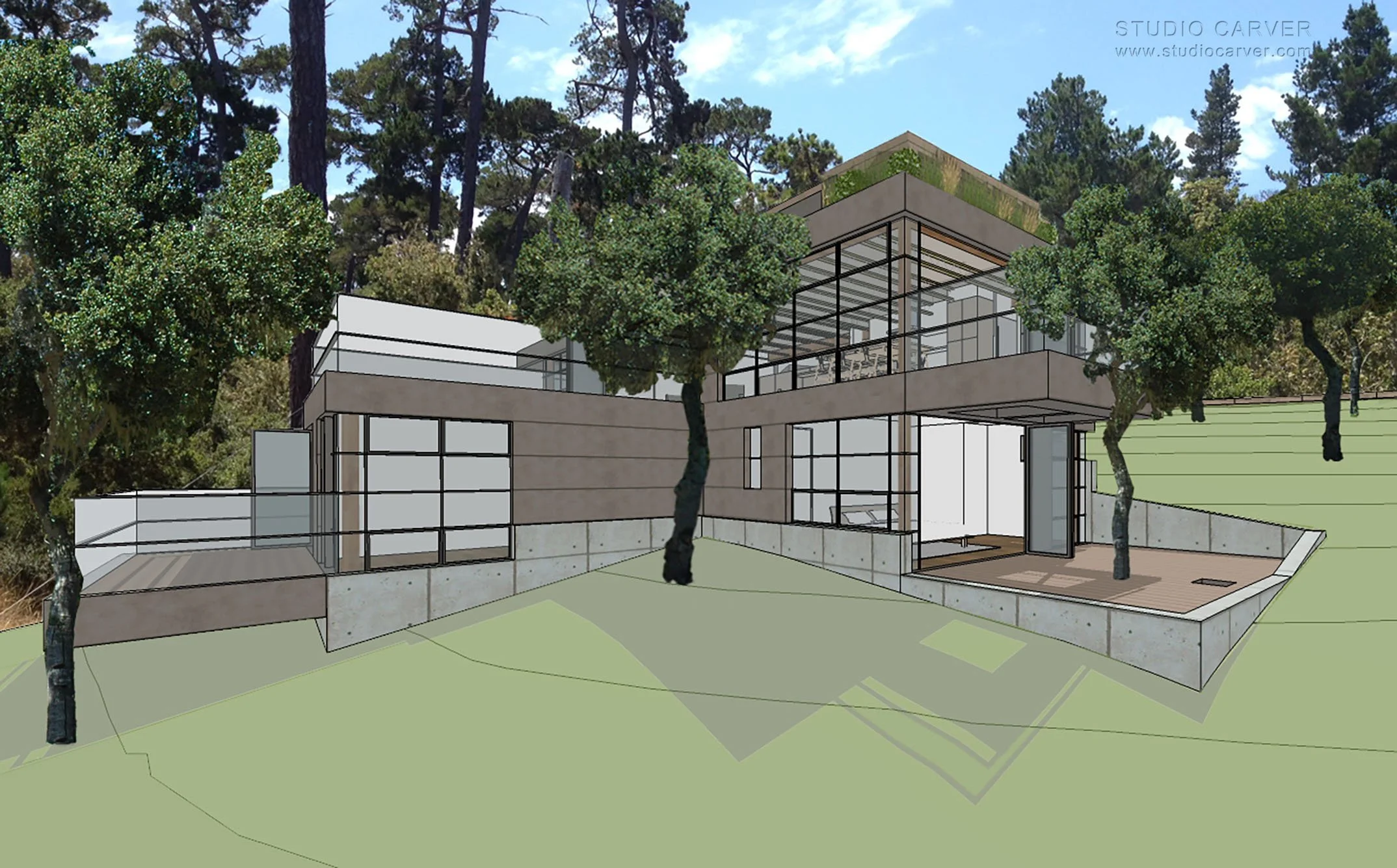 This house is divided into five 20’x20’ modules that are organized to fit between the existing trees on site. The modular design will facilitate and simplify the construction process. The exterior of the home and the adjacent garage are clad with gray-brown cement fiber panels that invoke the tone and texture of the surrounding coast live oaks. Folding glass panels open the house up to an additional 2,000 sf of outdoor deck area. The main living area is located on the upper level to take advantage of views towards Point Lobos and Carmel Bay. Views are further enhanced from the rooftop deck and pool.